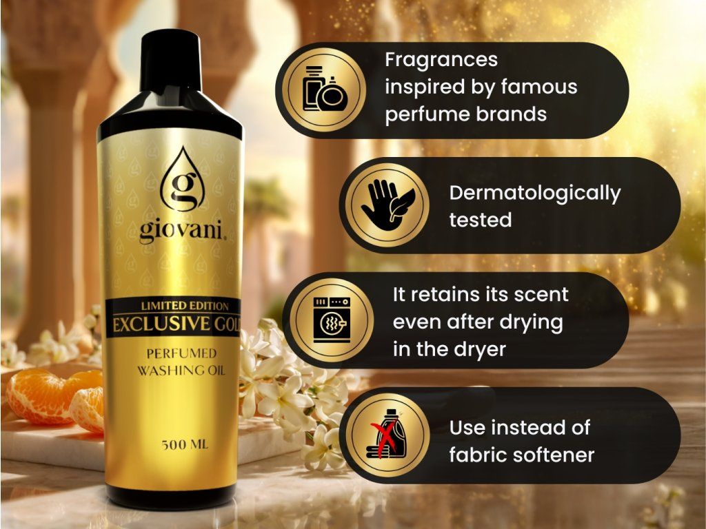 Giovani® is an exclusive and luxury brand of laundry perfumes. We have taken great care to ensure their high quality. When developing these fragrances, it was important for us to achieve their strong intensity and long lasting durability, so that we could speak of Giovani® as the finest quality laundry perfume brand on the market. Their great advantage is that they don't clog the washing machine, they don't leave a greasy residue and they don't stain clothes. Thanks to the content of some substances, our oils also take care of the colour of your laundry. They are vegan, free of dioxane, SVHC, parabens, tensides, PBT/vPvB substances, heavy metals, polluting residues, microplastics or nanoplastics. What adds to the uniqueness of the Giovani® brand is its luxurious design. We also pride ourselves on delivery within 24 hours and fast customer service. |