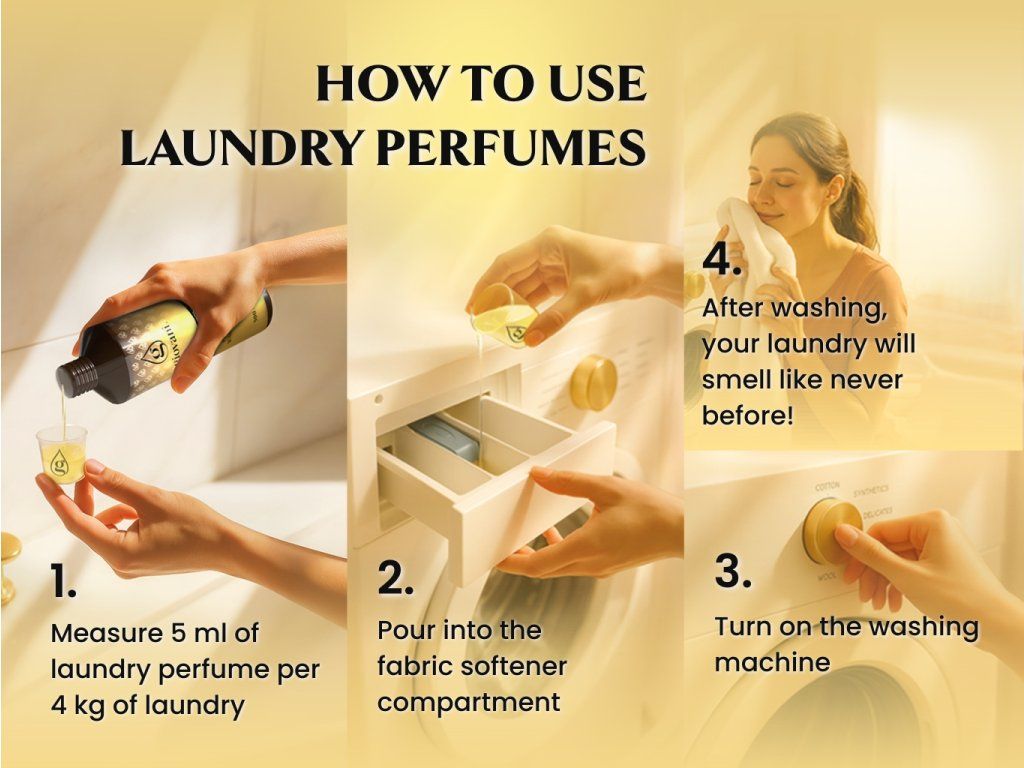 Do not put the perfume in the washing machine drum or in the dryer. They are directly intended for use in the fabric softener container. You don't have to worry about your laundry losing its scent after drying in the dryer. Giovani® perfumes are resistant to external influences and durable. Washed laundry will smell even after using the dryer. The optimum temperature for storing laundry oils is approximately 15-25 degrees Celsius