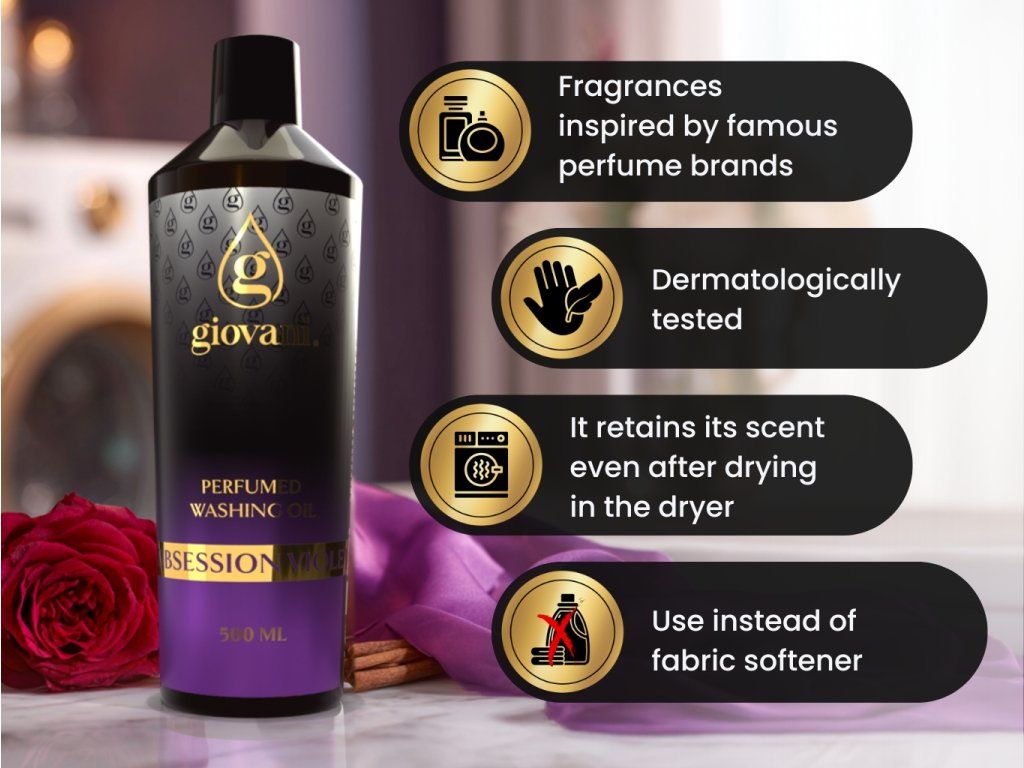 Do not put the perfume in the washing machine drum or in the dryer. They are directly intended for use in the fabric softener container. You don't have to worry about your laundry losing its scent after drying in the dryer. Giovani® perfumes are resistant to external influences and durable. Washed laundry will smell even after using the dryer. The optimum temperature for storing laundry oils is approximately 15-25 degrees Celsius
