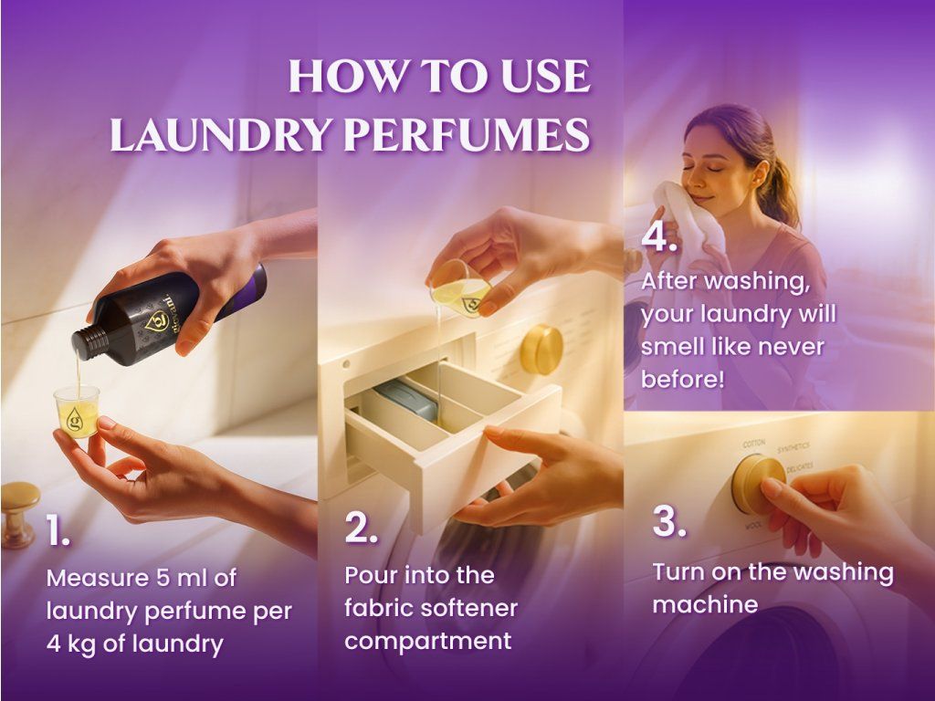 Usage: Pour 5 ml of concentrate into the fabric softener container. This amount is one dose for 4 kg of laundry. The concentrate is not diluted. For dosing, you can use the cap of Giovani® laundry perfume, which corresponds to 3 ml; we recommend using double the amount. To make dosing even more convenient, you can purchase a measuring cup with our logo or a pump for dosing. Just use a small amount and your laundry will be perfectly fragrant!